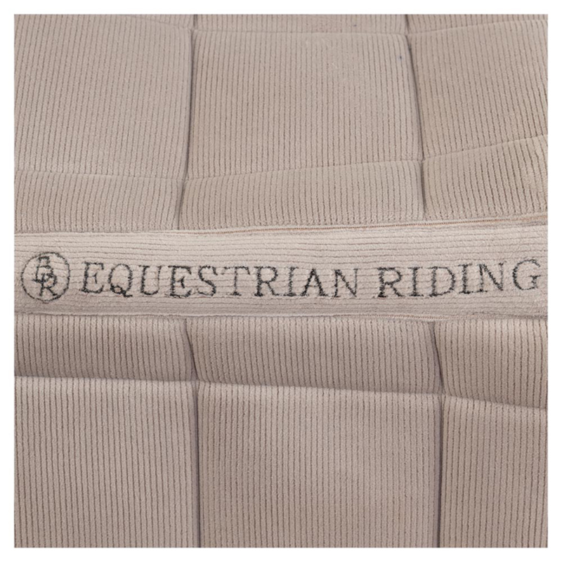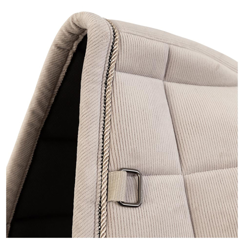 Het chique dressuur zadeldek June heeft een stijlvolle en zachte buitenstof van rib materiaal, is voorzien van een verstevigde padding onder de singellussen en prachtig gedecoreerd met een glitter sierkoord rondom.