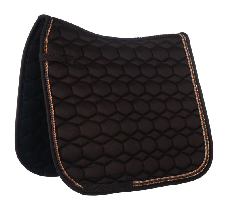 Het Rosegold Glamour Style zadeldek maakt indruk met zijn elegante diamantquilt en roségouden koord. Klittenbandsluitingen zorgen voor een goede grip op het zadel en de onderkant is gemaakt van functioneel materiaal dat vocht snel afvoert van het paard.