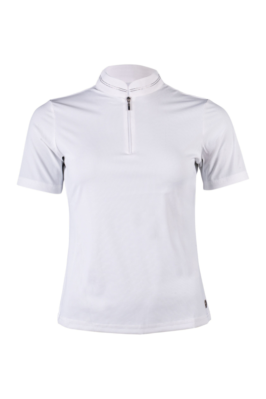 HARRY'S HORSE Wedstrijdshirt Sienna WitWedstrijdshirt met korte mouw, opstaande kraag met korte ritssluting, kristallen op de schouder en langs de rits en voorzien van lusjes op de kraag.Samesnstelling: 93% micropolyester / 7% elastan.Maat: XXS - XXL