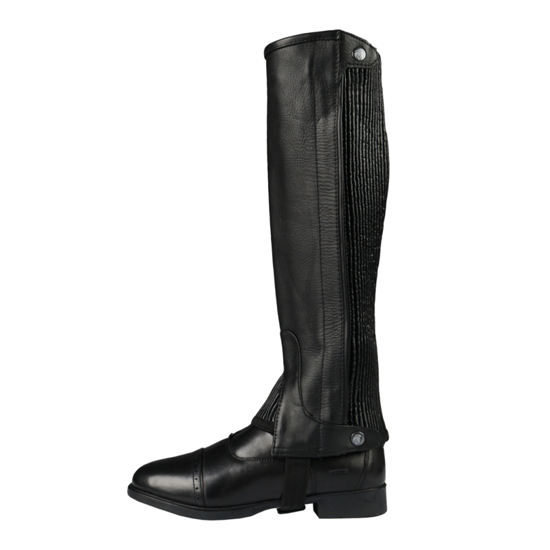 Chaps basiques en cuir, avec élastique au niveau du mollet et du cou-de-pied pour un ajustement parfait.