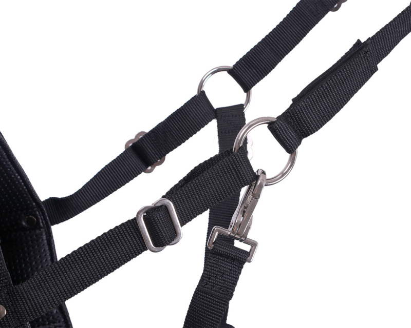 • Avec une fermeture auto-agrippante au niveau de la têtière qui s'ouvre à haute pression, afin de s'assurer que le cheval ne reste pas coincé.