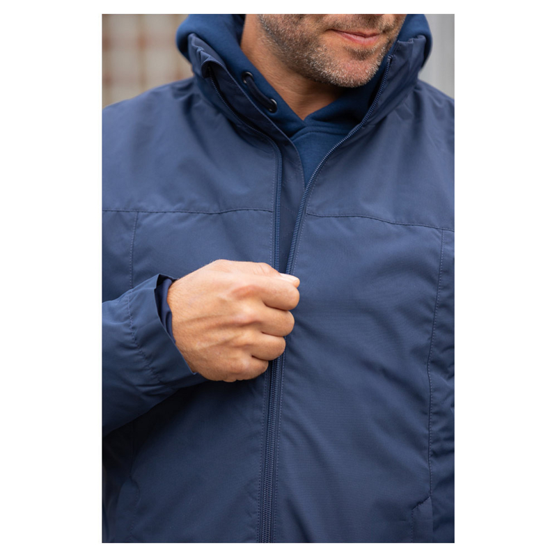 La capuche avec cordons ajustables peut être repliée dans le col grâce à la fermeture éclair. La fermeture éclair avant assortie est robuste et dispose d'un rabat coupe-vent à l'intérieur et d'un protège-menton en haut. Les extrémités des manches allongées et élastiquées avec des trous pour les pouces offrent plus de chaleur et de confort. Le logo BR sur la manche complète la veste.