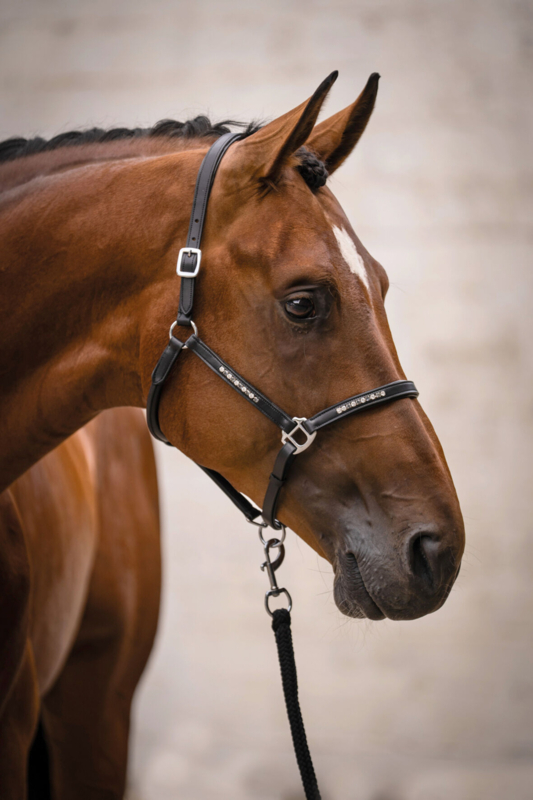 Eric Thomas Pro | Licol cuir grooming NoirLicol Eric Thomas Pro grooming avec double réglage de têtière et une muserolle de 26mm réglable par boucles, doublées cuir ton sur ton.Il est équipé d'une fixation rapide de la sous-gorge par mousquetons.Muserolle et…